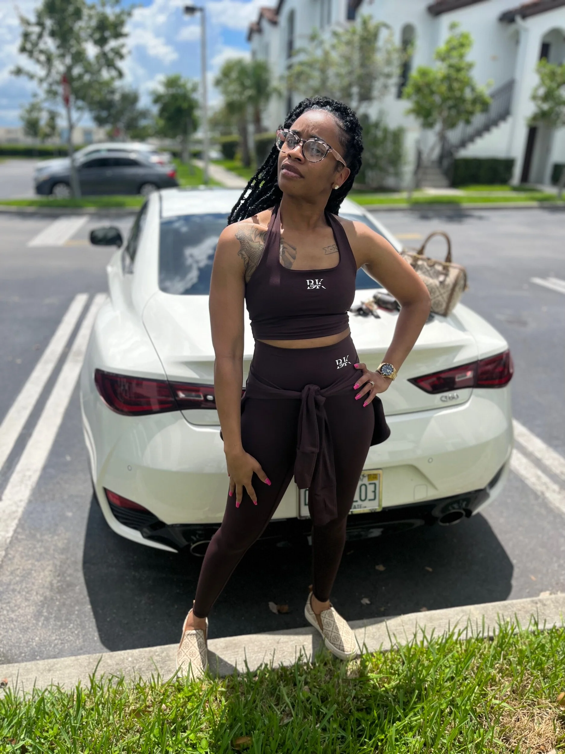 This is a chocolate brown set. It comes with the bra , pants and track jacket. The jacket has a whole in the sleeve where it fits like a glove. This set will snatch every area. Definitely true to size and snug fit.